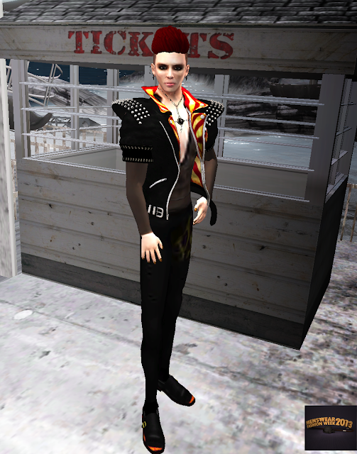 The second outfit is from Faster Pussycat, the designer has new rock n' roll inspired designs coming out for Menswear Fashion Week. Faster Pussycat will have a fashion show on April 24th 4-5pm SLT Come see the fashions and see Paradox Messmer model their latest. The hair and shoes will be new and available at Menswear Fashion Week.
